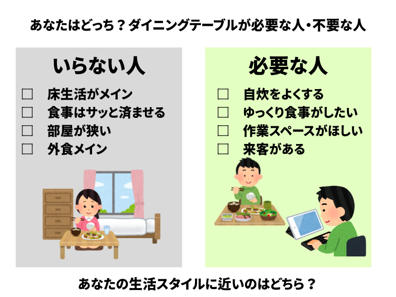 ダイニングテーブルが必要かどうかは、生活スタイルによって大きく変わります。